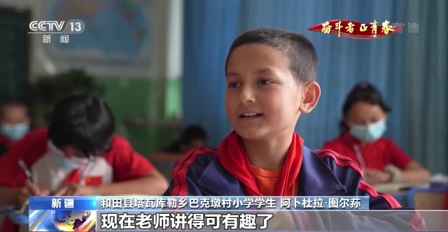 和田县塔瓦库勒乡巴克墩村小学学生 阿卜杜拉·图尔荪:我以前上学最害怕上数学课了,因为长方体的体积和正方体的体积,我老是搞不清楚,现在老师讲得可有趣了,我听懂了。