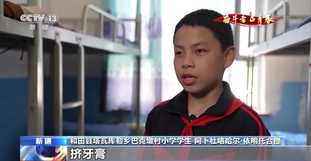 和田县塔瓦库勒乡巴克墩村小学学生 阿卜杜喀哈尔·依明托合提:老师帮我打洗脚水,挤牙膏,我们不洗不刷也不好意思了。
