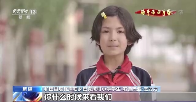 和田县塔瓦库勒乡巴克墩村小学学生 喀迪热亚·杰力力:我好想你,你什么时候来看我们。