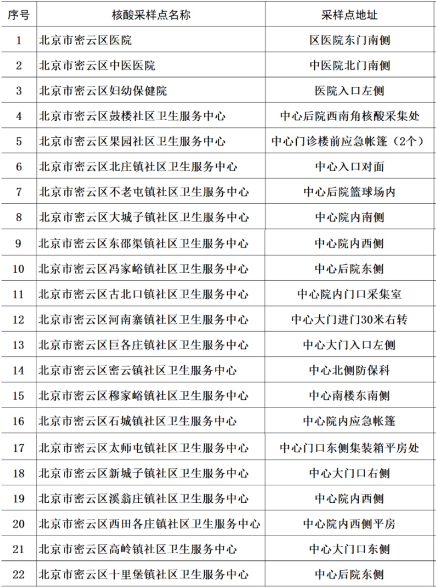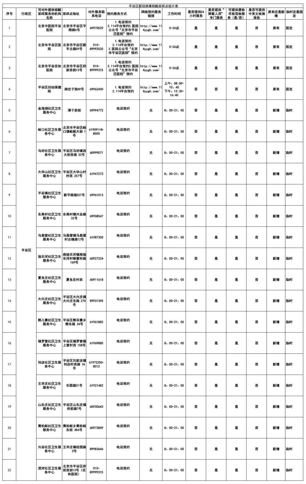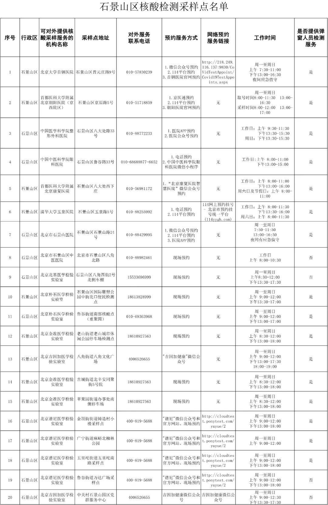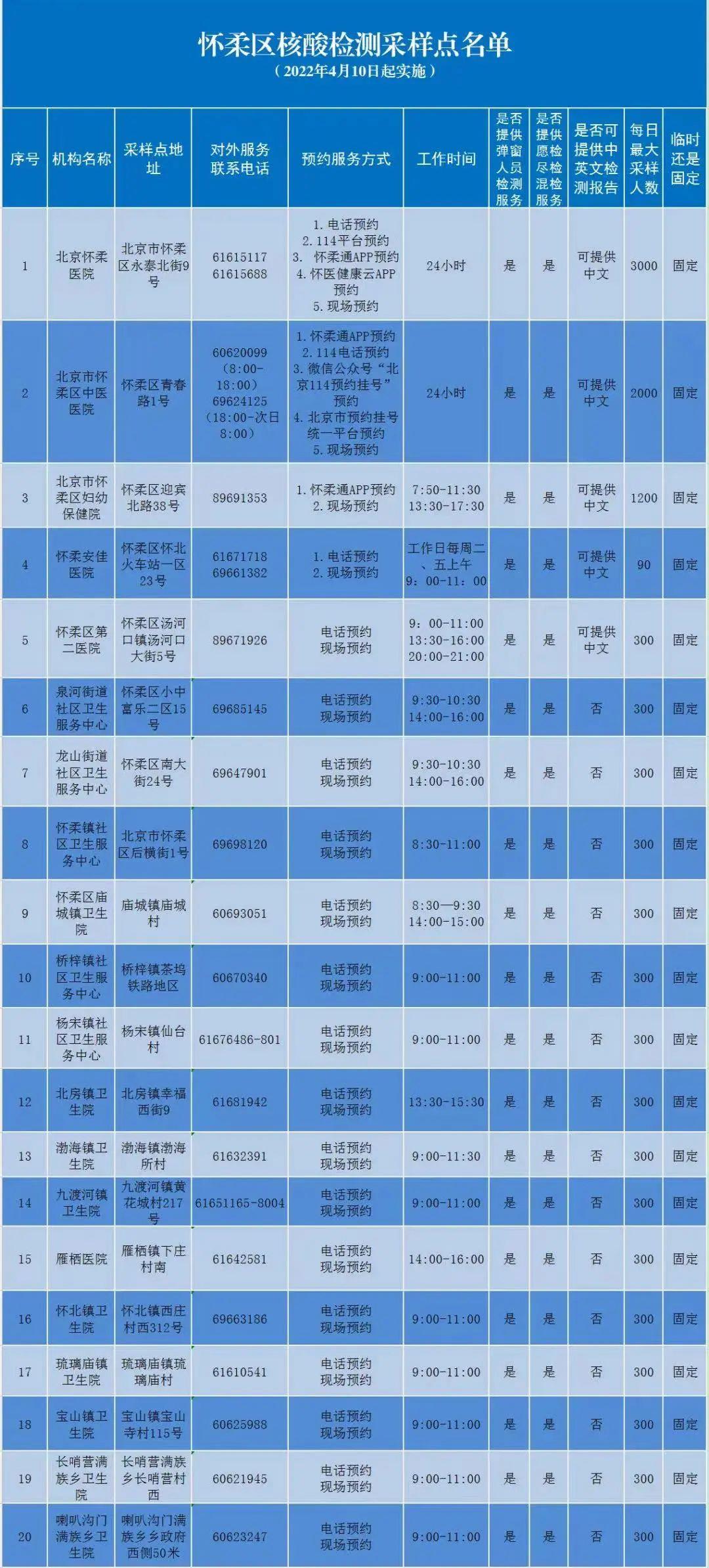 截至目前,朝阳区、门头沟区、密云区、平谷区、怀柔区、石景山区等,已公布常态化、固定核酸检测点位,以及各点位地址、工作时间、联系电话和预约方式。