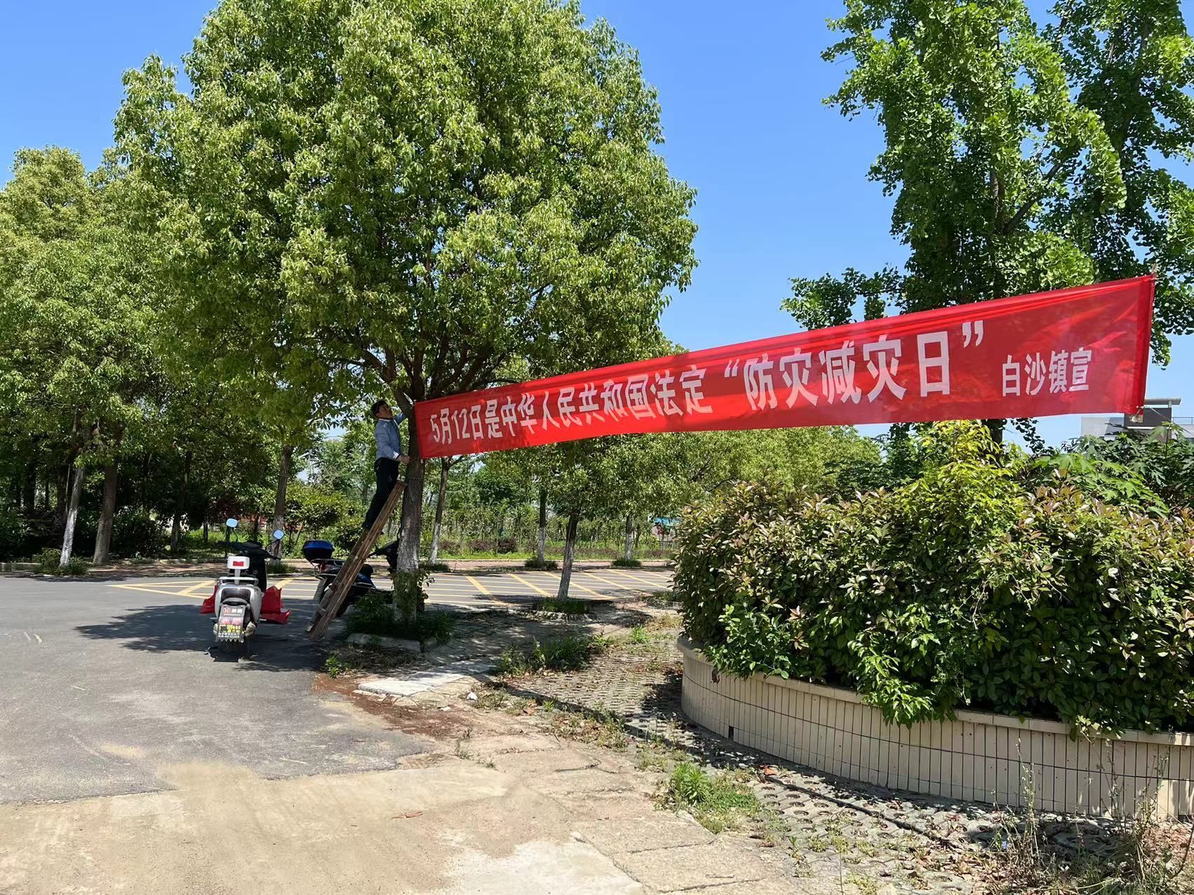 “防灾减灾千秋业 和谐家园万代兴……”5月6日,记者在白沙镇中心转盘看到,工人正在悬挂醒目的防灾减灾宣传横幅。在“防灾减灾日”来临之际,白沙镇党委政府坚持“防”字当头,积极完善防灾减灾救灾体系,保障人民群众生命财产安全,多措并举筑牢安全防线。