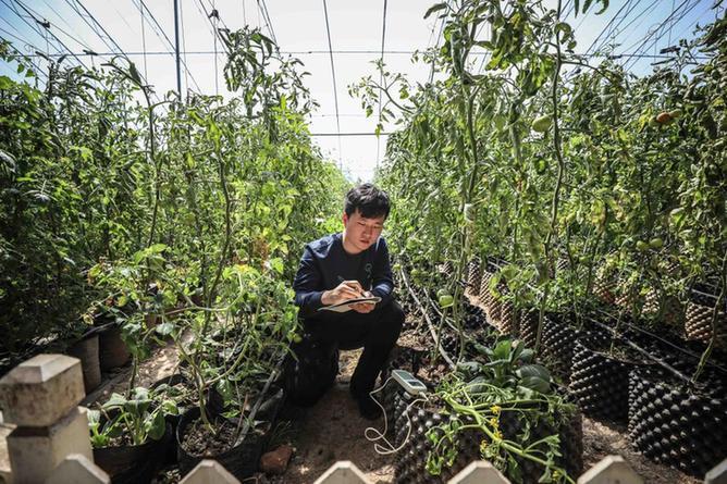 在辽宁省盘锦市大洼区田家街道大堡子村,郭佳明在温室大棚内查看碱地西红柿的生长情况。2019年4月15日新华社记者潘昱龙 摄