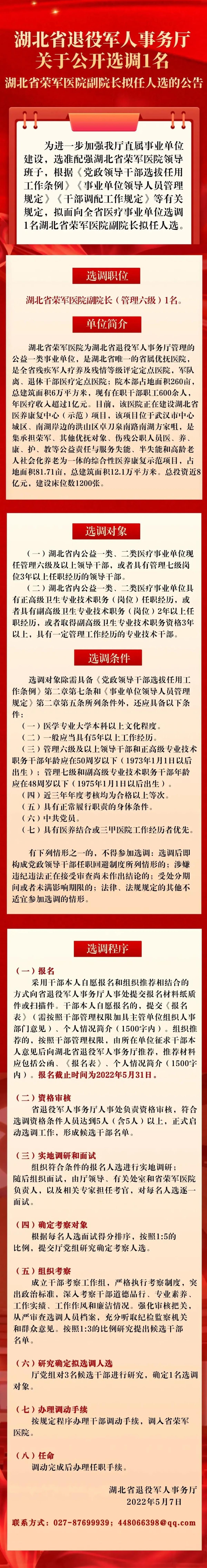 极目新闻记者5月7日从湖北省退役军人事务厅了解到,该厅拟面向全省医疗事业单位选调1名湖北省荣军医院副院长拟任人选。