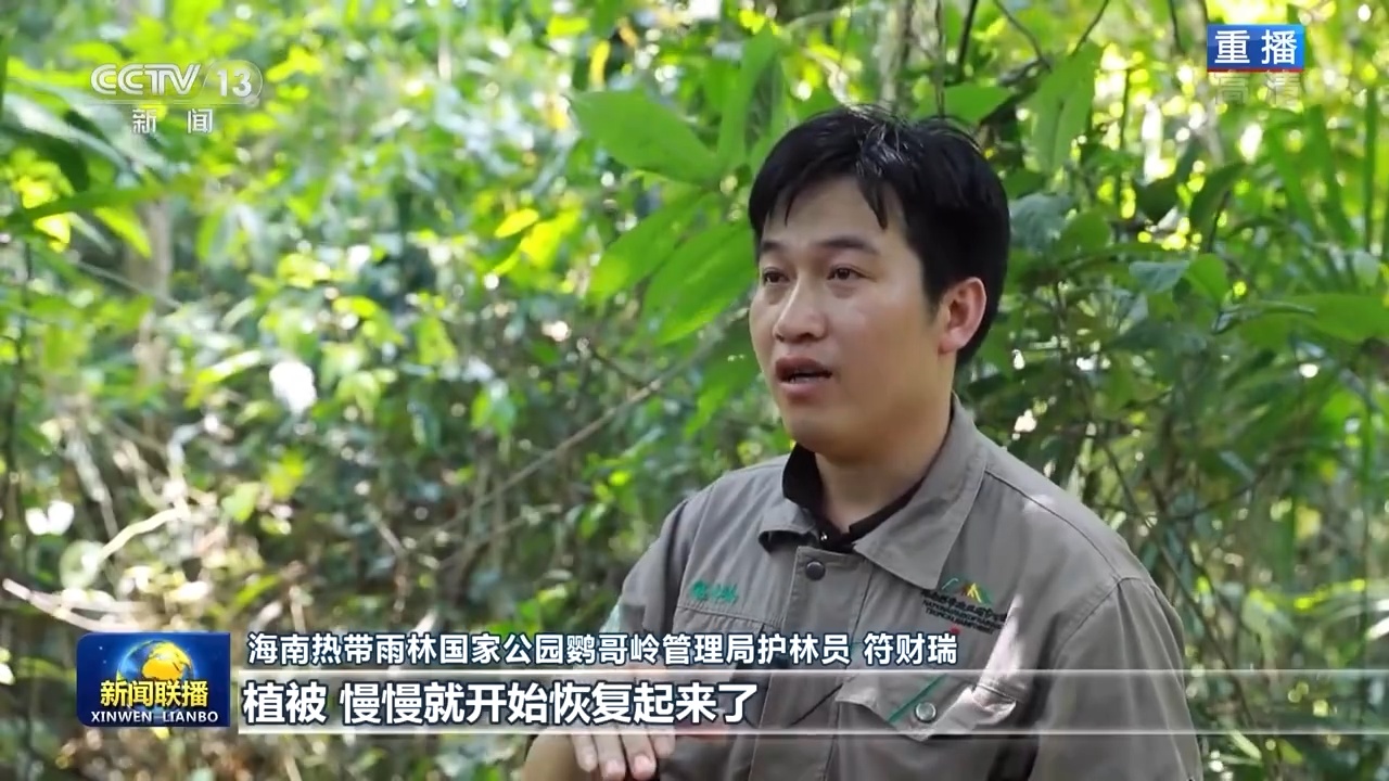 海南热带雨林国家公园鹦哥岭管理局护林员 符财瑞:植被慢慢就恢复起来了,比如以前满山都是光秃秃的,现在望眼过去都是绿绿青青的,就像习总书记说过,绿水青山就是金山银山,现在我们看到这片林子生机盎然,给我们一种很自豪的感觉。