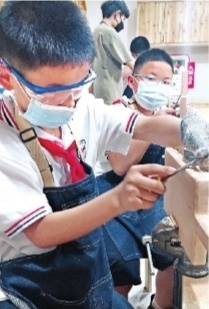 在红钢城小学“劳动美”文明实践活动基地,一堂有趣的手工课正在开展,501班的孩子们正在老师的指导下自己动手做砧板。学生王琳曦骄傲地说:“从构思到画图,再用手锯一点点制作,最后打磨涂橄榄油,我都能自己完成。”