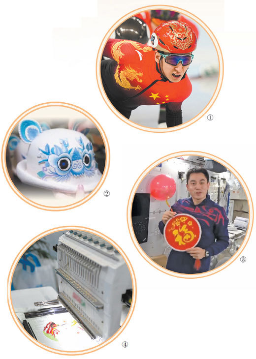 图①为短道速滑运动员武大靖比赛时身着国潮服饰;图②为2022年北京冬奥会开幕式各代表团引导员佩戴的虎头帽;图③为神舟十三号航天员叶光富在遥远的太空发来视频,向祖国和人民送上新春祝福(视频截图);图④为2021中国南通国际高端纺织产业博览会上展示的自动刺绣机器。资料图片 制图:赵偲汝