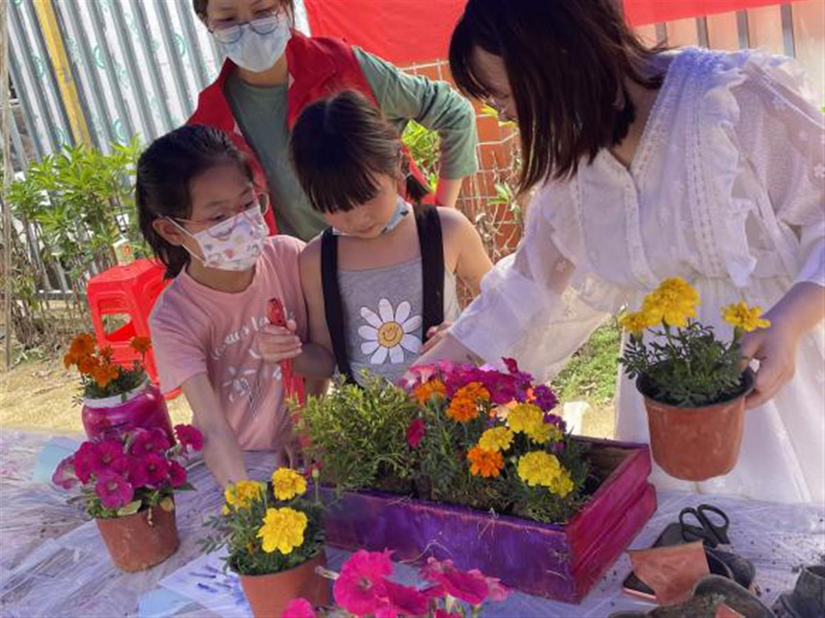经过大家富有魔力的彩绘和装扮,一件件看似普通的闲置物件瞬间有了新的生命和意义。经过大家的巧手改造,各组家庭分工合作、共同努力把带有属于自己家庭标识的改造容器种上了绿植,成为社区花园的一部分,进一步让居民的价值感得到提升。