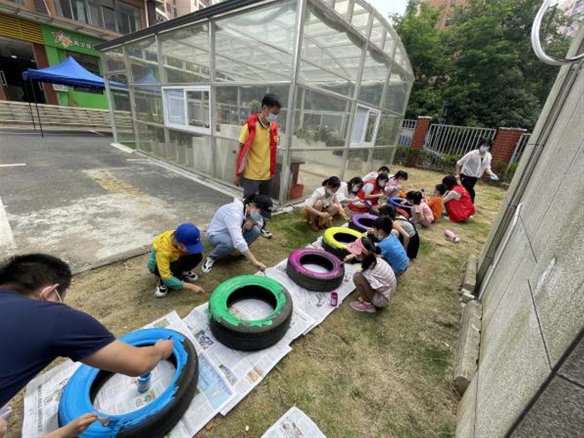 社区专程邀请创意美术老师带领各组家庭成员利用收集的奶粉罐、旧轮胎等闲置物件,通过创意画的方式进行美化,并由各家庭成员设计出属于自己家庭的标识,成为扮靓共享花园的重要元素。