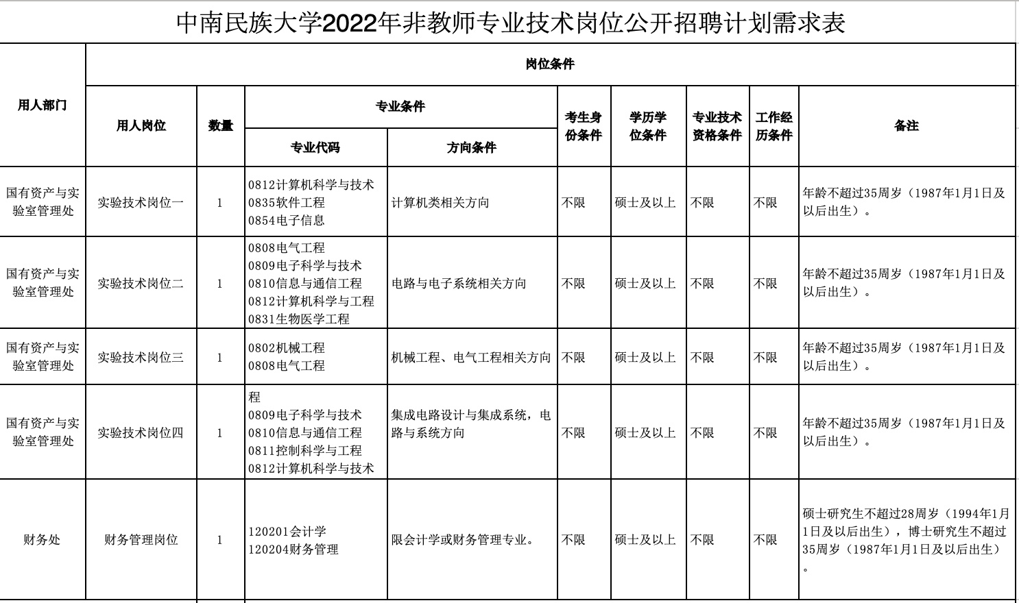 非教师专业技术岗位5个(实验技术岗位4个,财务管理岗位1个)。