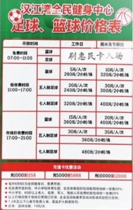 汉江湾全民健身中心设置有多块足球场。球场价格公示显示,免费时段为工作日及周末的7时至11时,11时至17时则为低收费时段。