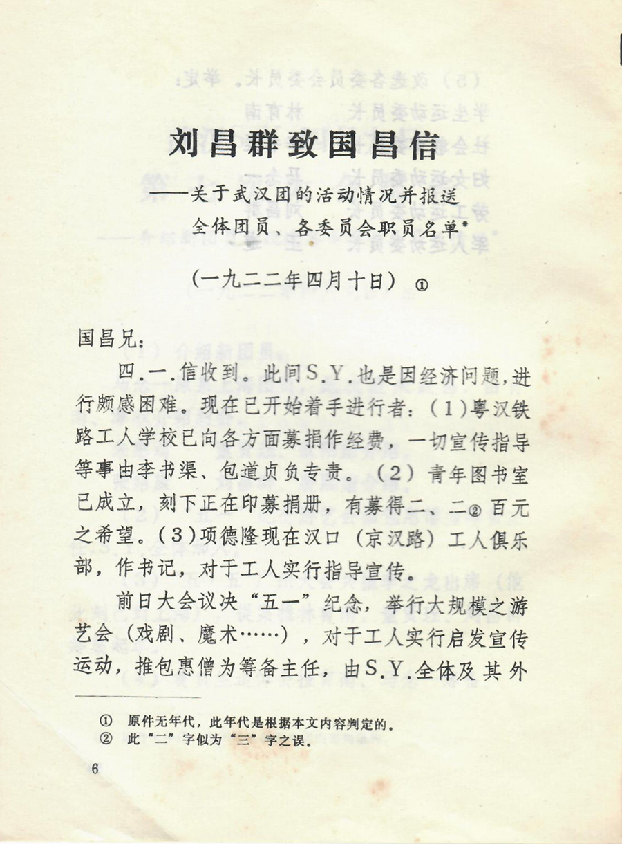 1922年4月17日《刘昌群致国昌信——关于武汉团的活动情况并报送全体团员、各委员会职员名单》