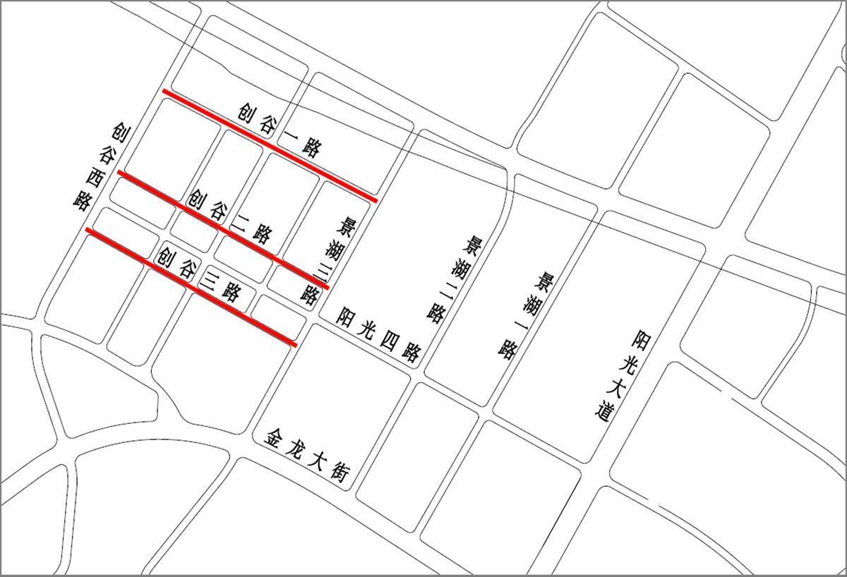 位于江夏区庙山高新技术产业园,东西走向,西起创谷西路,东至景湖三路,全长667米,宽15米,因位于阳光创谷产业园,采用序列命名的方式,拟命名为“创谷三路”。