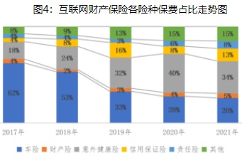从互联网非车险险种来看,2021年,意外健康险、信用保证险、责任险、财产险[ 包括企业财产险和家庭财产险。]及其他险种累计保费收入分别为290亿元、112亿元、68亿元、40亿元和128亿元,分别占互联网财产保险保费收入的34%、13%、8%、5%和15%。从保费增速来看,意外健康险全年保费收入同比下降9%,信用保证险、责任险、财产险及其他险种保费收入同比上升分别为80%、43%、28%和11%。从保费收入同期变动值来看,2021年信用保证险、责任险、财产险和其他险种合计贡献增量91亿元,其中信用保证险贡献增量50亿元,责任险贡献增量20亿元。