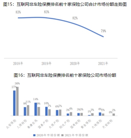 2021年,互联网非车险市场集中度继续下降,保费排名前十家保险公司合计市场份额为79%,同比下降3个百分点。其中,众安保险、人保财险、太保产险、阳光产险、国寿财险、紫金保险、天安财险市场份额同比均有所提升,其余公司市场份额均有所下降。