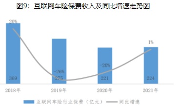 2021年,互联网车险实现累计保费收入224亿元,同比增长1%,结束连续两年的负增长局面;同时,互联网车险保费收入同比增速较整体车险高出7个百分点。