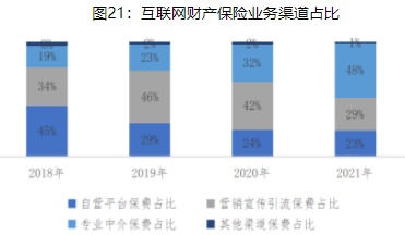 备注:根据保险业协会2021年统计口径,互联网财产保险业务来源渠道分为保险公司自营平台(包括官网和移动端,不包括营销宣传引流业务)、保险专业中介机构、营销宣传引流和其他渠道。