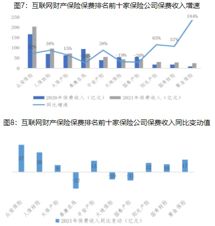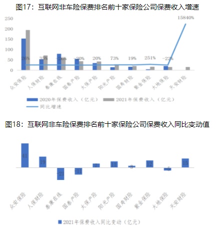 从保费增速来看,2021年互联网非车险保费规模前十家保险公司合计保费收入同比增长17%,较整体高出6个百分点。从保费收入同比变动值来看,众安在线、人保财险、天安财险、紫金保险、阳光产险、太保产险贡献增量分别为41亿元、19亿元、15亿元、12亿元、11亿元、7亿元,是互联网非车险保费增长的主要贡献力量。