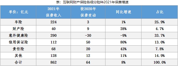 根据保险业协会统计,2021年,互联网财产保险累计实现保费收入862亿元,同比增长8%,较财产险行业整体保费增速高出7个百分点。
