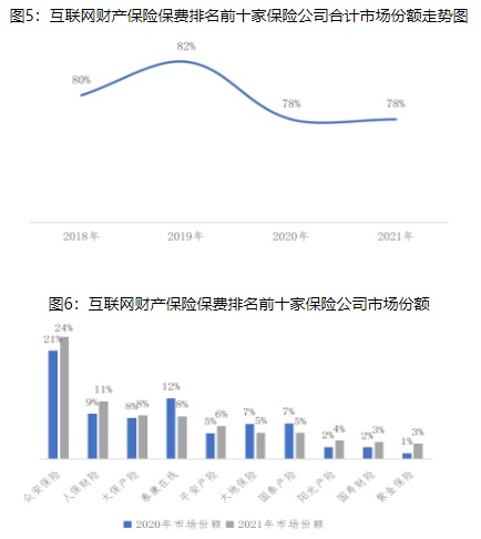 2021年,互联网财产保险市场集中度与同期相比较为平稳,保费规模前十家保险公司合计市场份额为78%,同比基本持平。其中,众安保险、人保财险、太保产险、平安产险、阳光产险、国寿财险、紫金保险市场份额同比均有所提升。