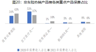 根据保险业协会统计,在前60个互联网非车险热销产品中,2021年仍主要聚焦于退货运费险和以百万医疗险为主的健康险产品,保费收入占比分别为43%和37%。其中,退货运费险保费占比同比上升9个百分点,而以百万医疗为主的健康险产品保费占比同比下降15个百分点。具体来看,健康险产品内部结构发生改变,2020年上榜的特药防癌险在2021年落榜,而团体特定医疗保险产品于2021年上热销榜,保费占比约为8%。另外,在非车险热销产品中,信用保证类保险产品保费占比达10%,同比上升9个百分点;航旅出行类保险产品保费占比为4%,同比小幅下降1个百分点。由此来看,各保险公司主要非车险产品集中度仍然较高,但逐渐显现分散多元化趋势,健康险团险类业务逐步增长。
