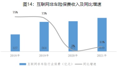 2021年,互联网非车险实现累计保费收入639亿元,同比增长11%,较2020年保费增速上升9个百分点。