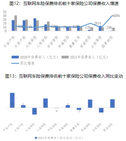从保费增速来看,2021年互联网车险保费规模前十家保险公司合计保费收入同比增长16%,较整体高出15个百分点。从保费收入同比变动值来看,平安产险、人保财险、国寿财险及安诚财险分别贡献增量12亿元、8亿元、7亿元、7亿元,是互联网车险保费增长的主要贡献力量。