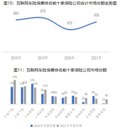 2021年,互联网车险市场集中度较同期有所提高,保费收入排名前十家保险公司合计市场份额为85%,同比提升4个百分点。其中,平安产险、太保产险、人保财险、华海财险、安诚财险、国寿财险市场份额同比均有所提升。在车险综改后时代,车险业务发展趋于规范,头部保险公司依托其规模效应和成本管控能力,市场集中度逐步提升。