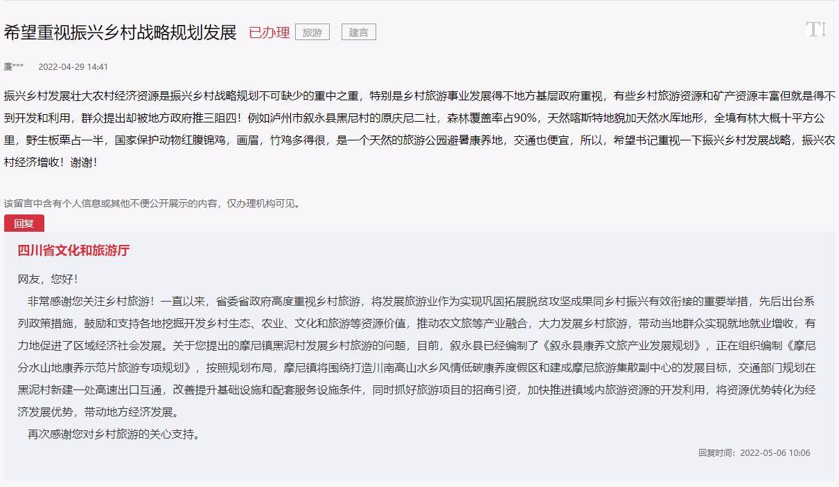 在回复中,四川省文旅厅对网友关注支持乡村旅游表示感谢,并表示一直以来,四川省委、省政府高度重视乡村旅游,将发展旅游业作为实现巩固拓展脱贫攻坚成果同乡村振兴有效衔接的重要举措,先后出台系列政策措施,鼓励和支持各地挖掘开发乡村生态、农业、文化和旅游等资源价值,推动农文旅等产业融合,大力发展乡村旅游,带动当地群众实现就地就业增收,有力地促进了区域经济社会发展。