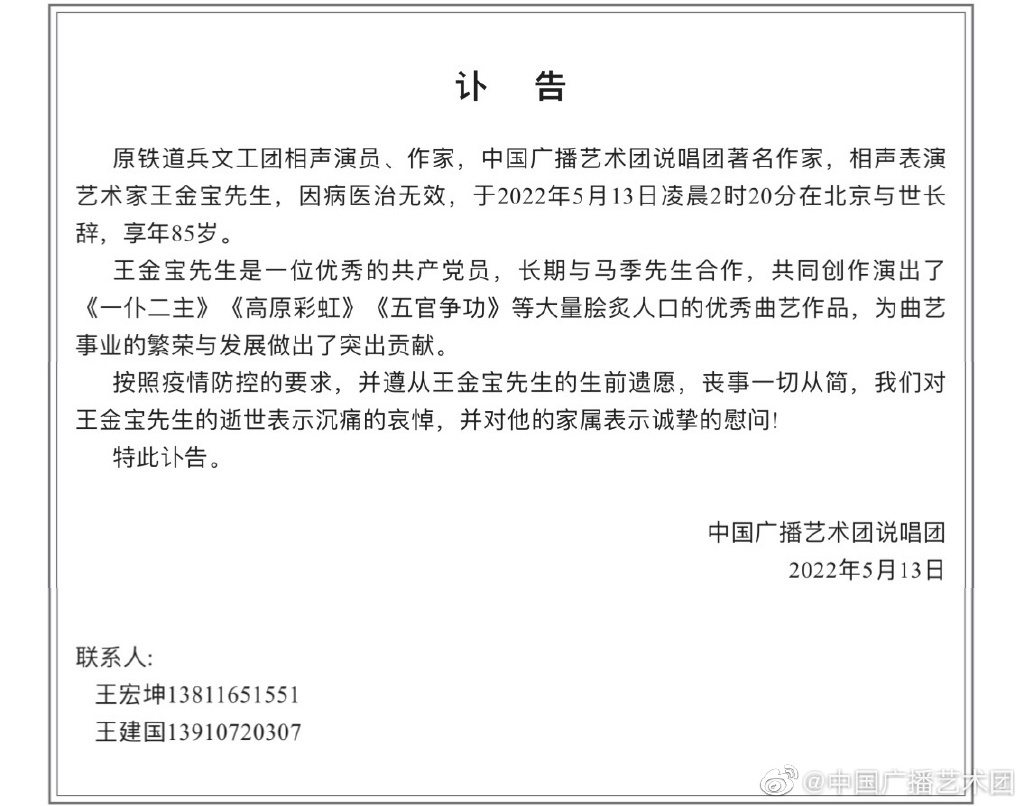 中新网客户端北京5月14日电 中国广播艺术团14日发布讣告称,中国广播艺术团说唱团著名作家,相声表演艺术家、原铁道兵文工团相声演员、作家王金宝,因病医治无效,于2022年5月13日凌晨2时20分在北京与世长辞,享年85岁。