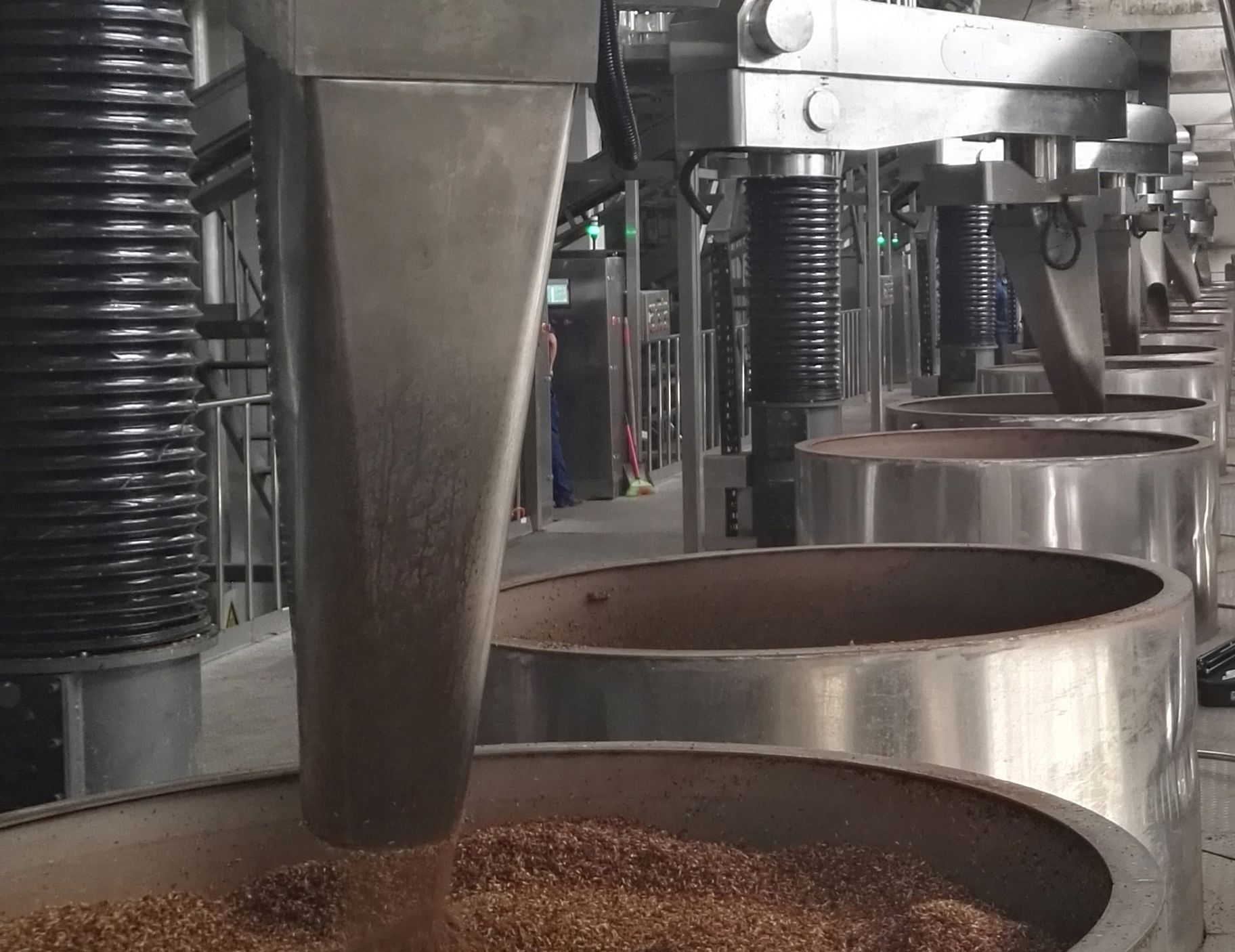 传统制作过程中,工人们通常使用木锨、簸箕等工具把酒醅抓出,一边撒上清蒸过的谷壳,一边用打糟机将酒醅打散,使其疏松便于上甑。