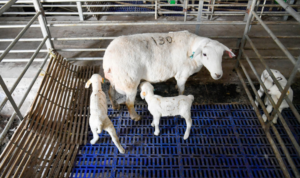 在天津奥群牧业有限公司核心育种场,刚出生不久的小羊依偎在种羊身边(4月16日摄)。新华社记者孙凡越摄