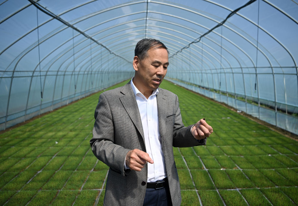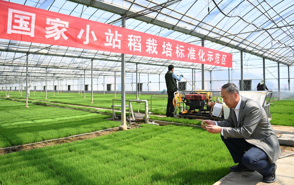 于福安在育秧基地内查看秧苗长势(4月15日摄)。新华社记者李然摄