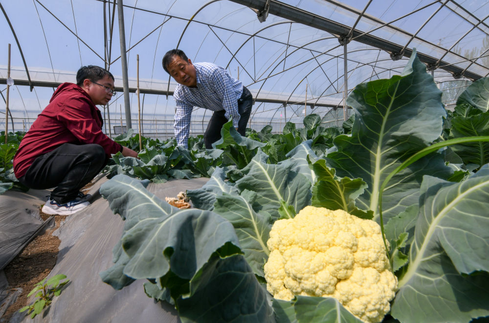 在天津市农业科学院创新基地,孙德岭(右)与副研究员牛国保在实验地里调查不同试验组合花椰菜种长势情况(4月19日摄)。新华社记者孙凡越摄