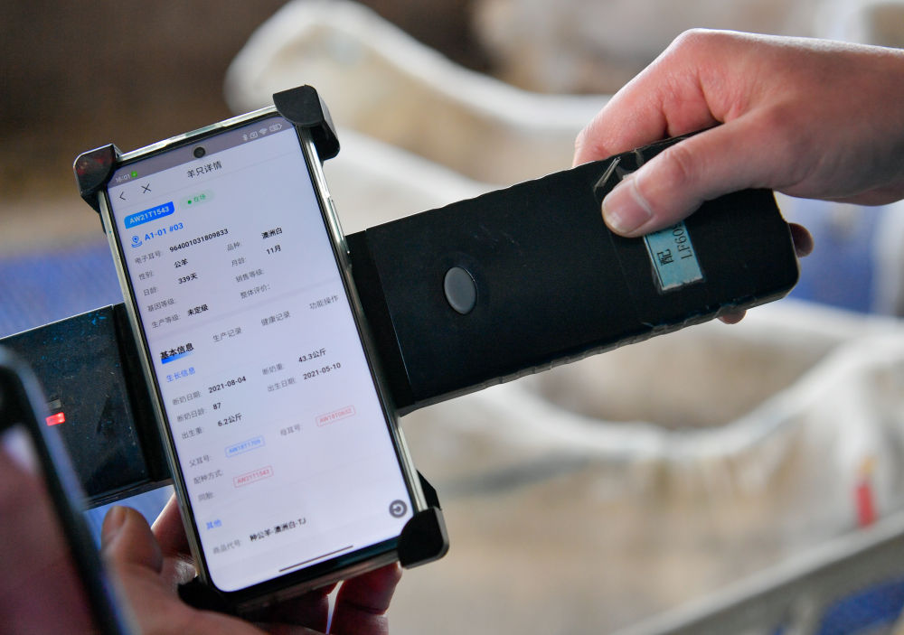 在天津奥群牧业有限公司核心育种场,工作人员通过手持扫描终端读取种羊信息(4月16日摄)。新华社记者孙凡越摄