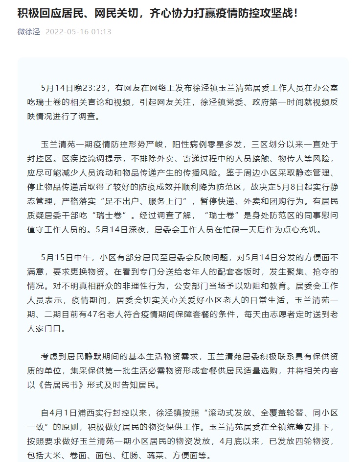 5月14日晚23时23分,有网友在网络上发布(上海青浦)徐泾镇玉兰清苑居委工作人员在办公室吃瑞士卷的相关言论和视频,引起网友关注,徐泾镇党委、政府第一时间就视频反映情况进行了调查。