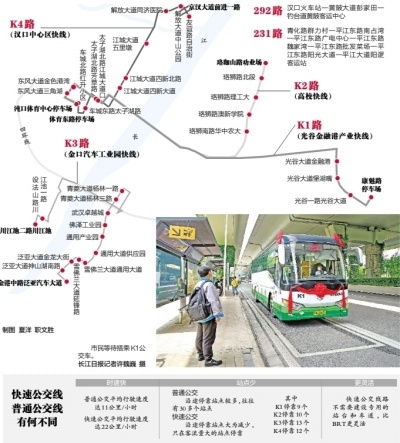据介绍,这4条以“K”字打头的公交线路,从车谷出发,分别开往光谷、武昌、江夏、汉口。加上已开通的292路公交和231路公交,至此武汉的快速公交线路达到6条。
