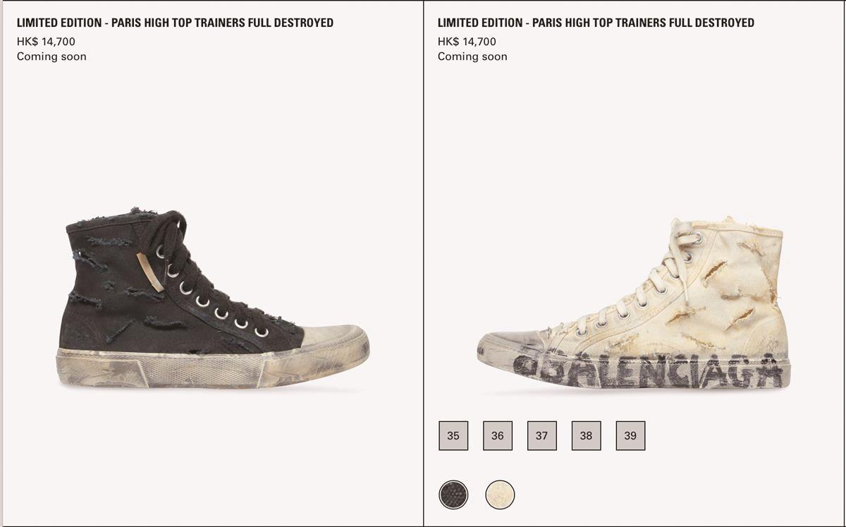 5月16日,“巴黎世家破烂鞋一双卖1.2万元”也登上微博热搜。当日,极目新闻记者在巴黎世家中国香港官网上看到这双“全磨损”运动鞋,定价为14700港币,有一黑一白两种颜色。产品说明介绍其为全棉材质,但全部鞋面都有撕裂痕迹,鞋底印有Balenciaga标识。不过,这一高筒帆布鞋也有全新版本,黑、白、红三种颜色,定价为5200港币,价格为磨损版的一半不到。