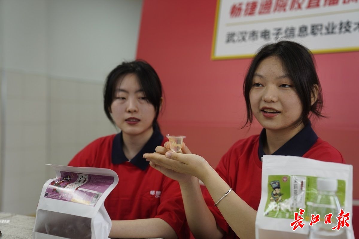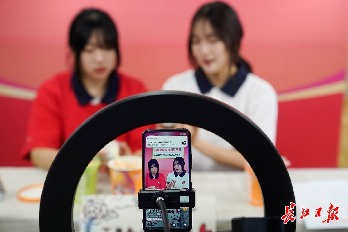 长江日报大武汉客户端5月17日讯(记者刘嘉 通讯员曹英)“家人们,我们的牦牛肉酱营养高,高在哪里,我们来看配料表啊……”5月16日上午,武汉市电子信息职业技术学校里,一间教室被布置成了“直播间”,两名女生正面对镜头“直播带货”。镜头外,有同学盯着手机、电脑屏幕看直播效果,还有同学对照直播流程,给主播递送商品。教室的一角,老师一边看同学们的表现,一边做着记录。