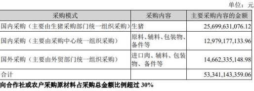 报告期内,公司报告期采购金额合计533.41亿元,其中,国内生猪采购金额257.00亿元,国内原料、辅料、包装物等采购金额129.79亿元,国外进口肉、辅料、包装物等采购金额146.62亿元。