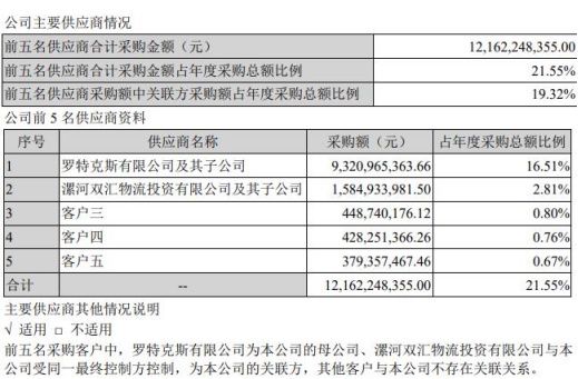报告期内,公司前五名供应商合计采购金额121.62亿元,占年度采购总额比例21.55%,其中,罗特克斯有限公司为公司母公司,漯河双汇物流投资有限公司与公司受同一最终控制方控制,为公司的关联方。