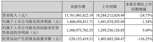 此外,公司2022年一季报显示,报告期内,公司营业收入实现137.62亿元,同比减少24.73%,归属于上市公司股东的净利润14.60亿元,同比增长1.34%,归属于上市公司股东的扣除非经常性损益的净利润13.69亿元,同比增长5.69%,经营活动产生的现金流量净额-2.28亿元,同比减少116.25%。