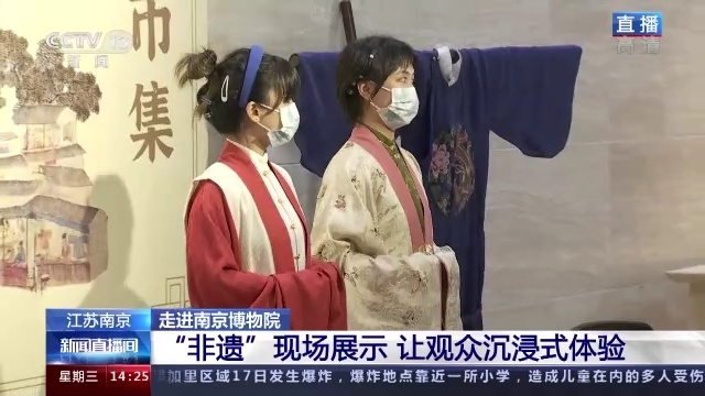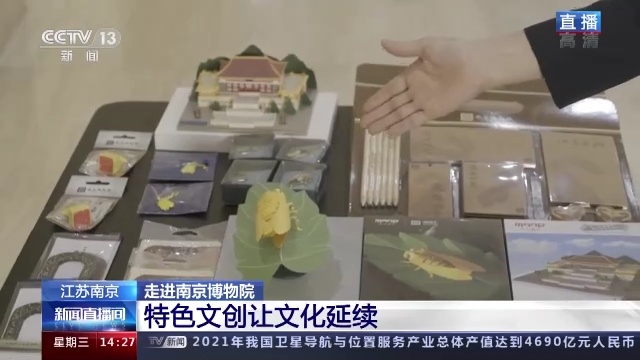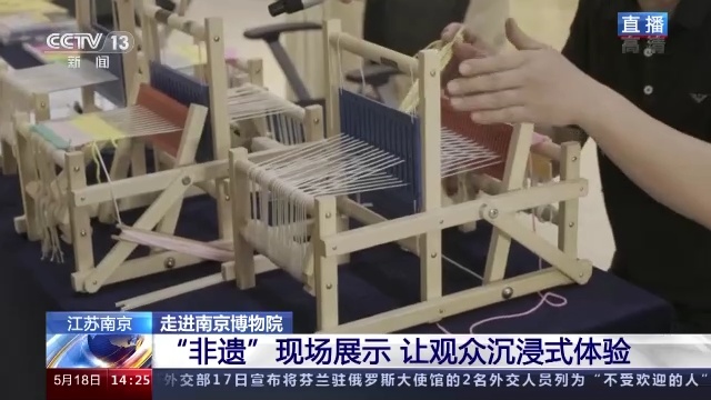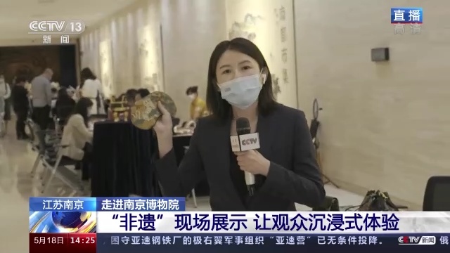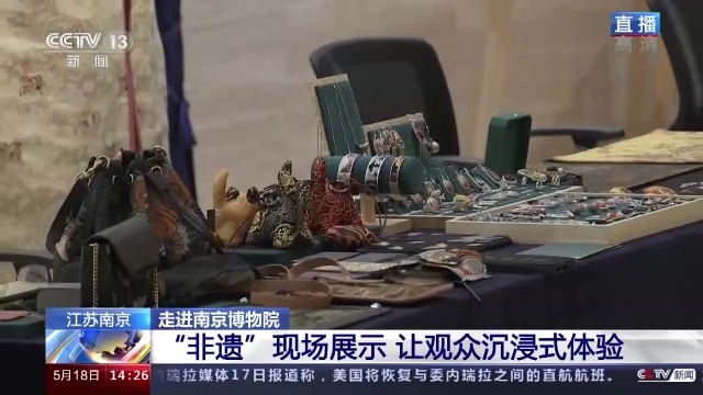 总台记者 杨滢:南京是中国六大古都之一,来到南京,你必然不能错过的就是我们现在所在南京博物院,今天是国际博物馆日,南博准备了一些特色的主题活动,我带大家来逛逛这个展厅里的“南都市集” ,今天有四组非遗传承人和手工艺人来到这里,展演的项目有金箔、绒花、云锦,等等。