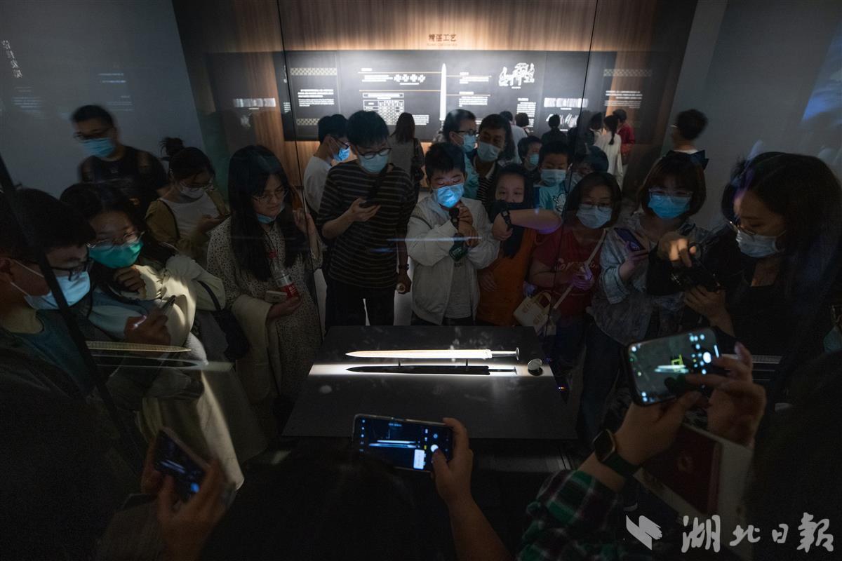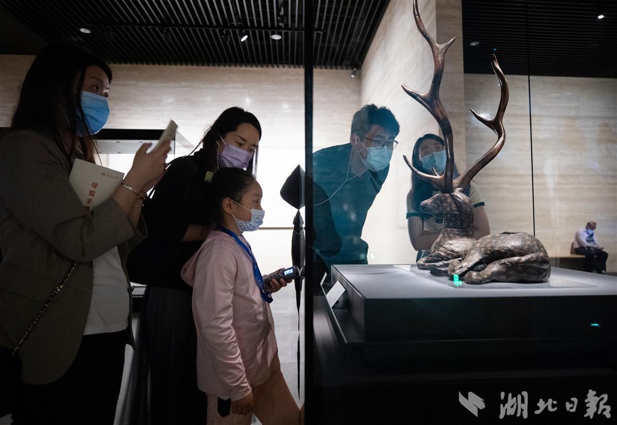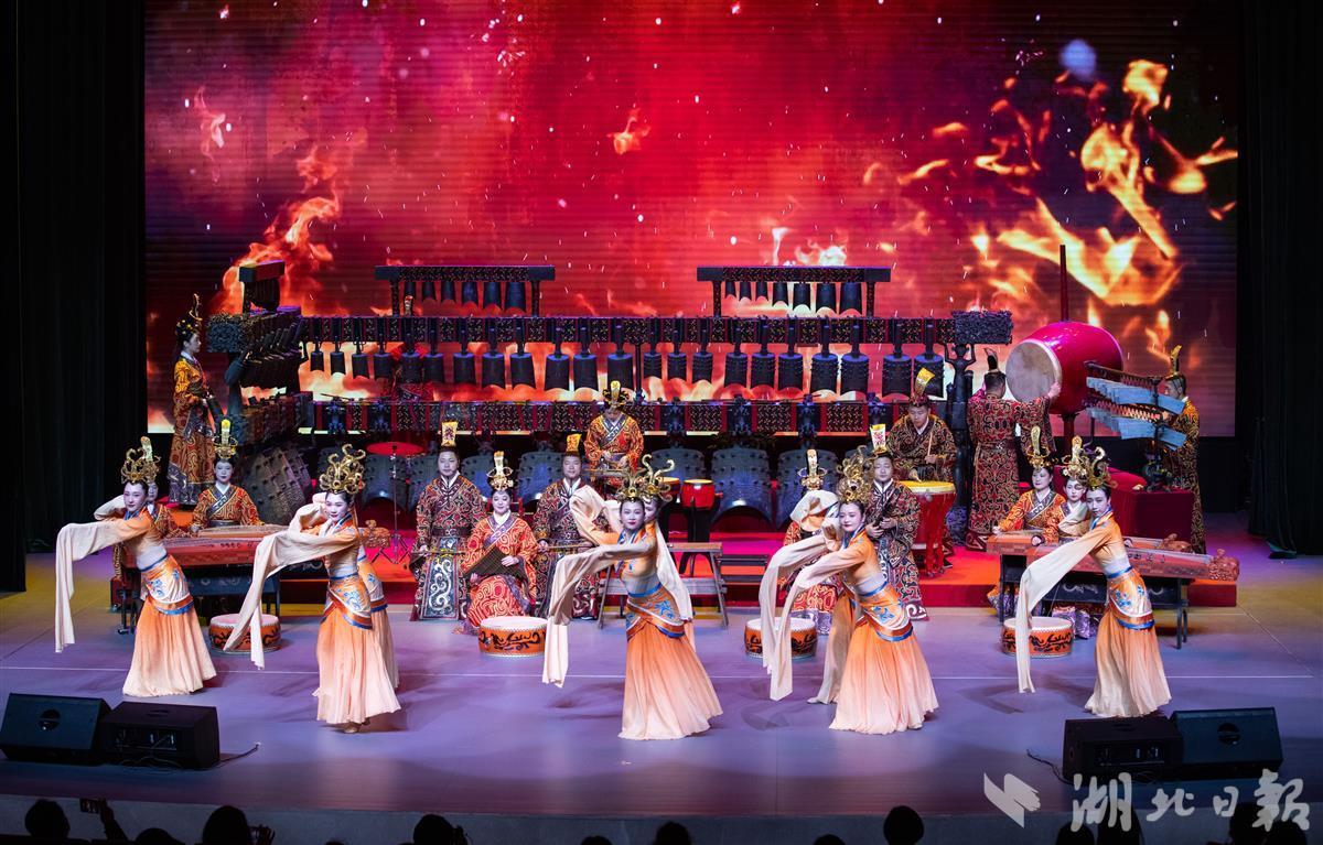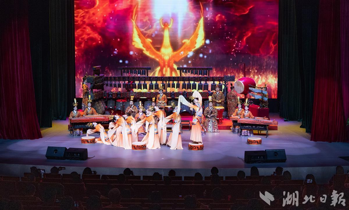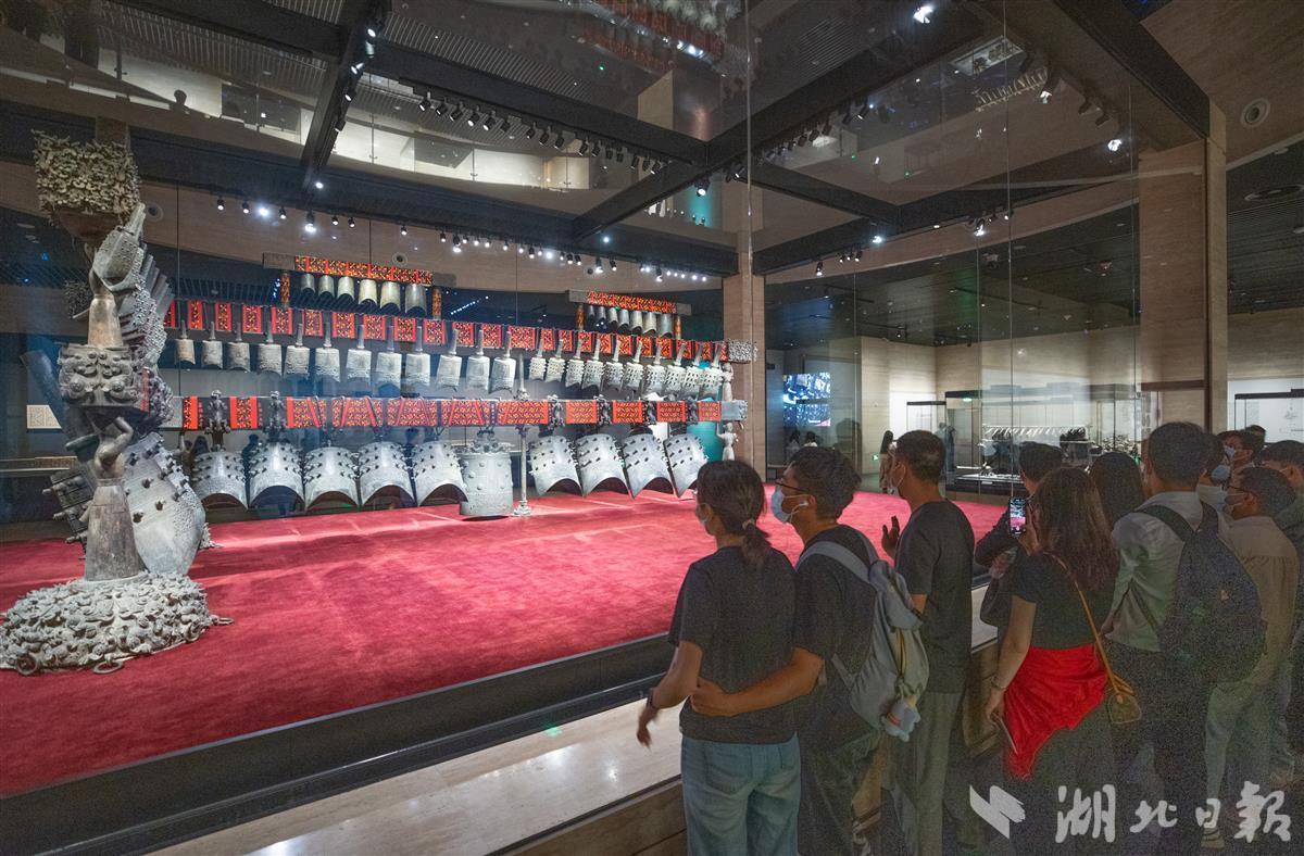 5月18日晚,观众在湖北省博物馆观看编钟乐舞夜场演出。当天是国际博物馆日,湖北省博物馆开放夜游活动,吸引了众多游客前来参观。(湖北日报全媒记者 柯皓 摄)
