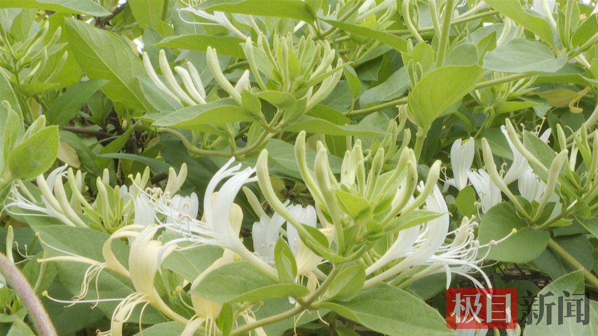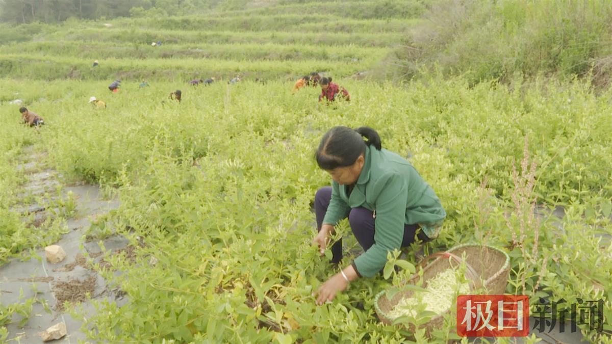 村民采摘金银花,每人每天最多可获100元以上的收入。