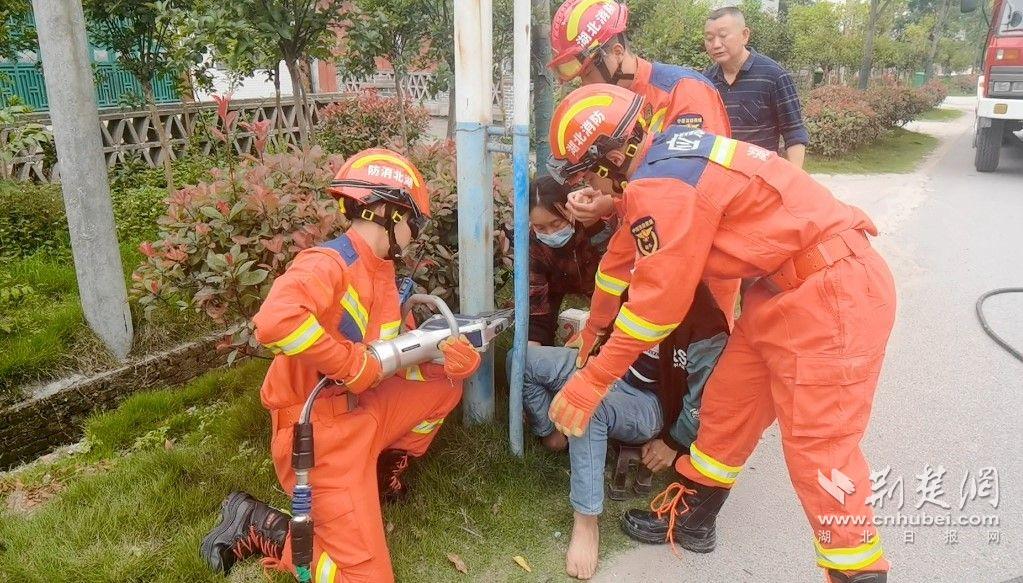 荆楚网(湖北日报网)讯(通讯员 朱燕林 黄赞 黎丹)5月18日下午16时,咸宁市通城县一男子在行车途中因骑摩托车突发情况导致右腿被卡路灯杆中间无法取出。咸宁市消防救援支队通城大道消防站接到求助电话后,迅速出动1辆消防车、5名指战员赶往现场处置。
