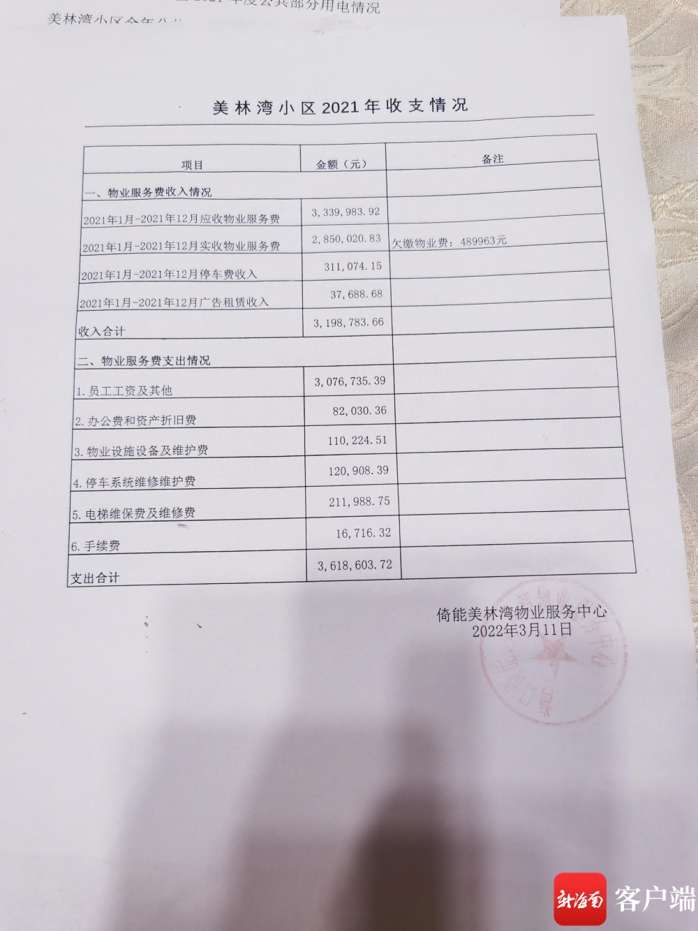 记者看到物业公开的2021年收支情况,该文件将电梯广告费、停车费及物业服务费合并在物业服务费收入中,并没单独列出公共收益。从文件上看,物业服务费支出使用了应属于业主的公共收益,物业对业主提出的异议也并没有给出合理的解释。