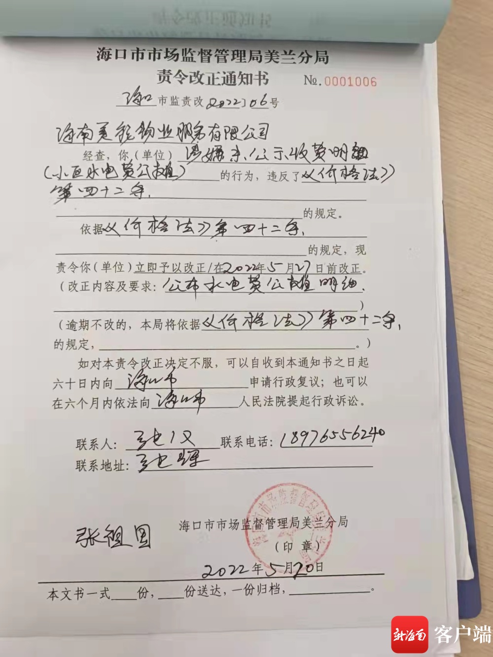 5月19日,记者到小区调查发现,该物业在公示收支明细、公摊费用明细、公共收益明细上并没做好整改。灵山市场监管所主任张汉要求物业公司当天交出小区多项收支明细,物业公司经理却以“依法办事”为由,认为市场监管所要求不合理,拒不公示。张汉已对该物业下达责令改正通知书,要求物业详细公示小区公摊费用明细,若不改正将依法对其进行处罚。