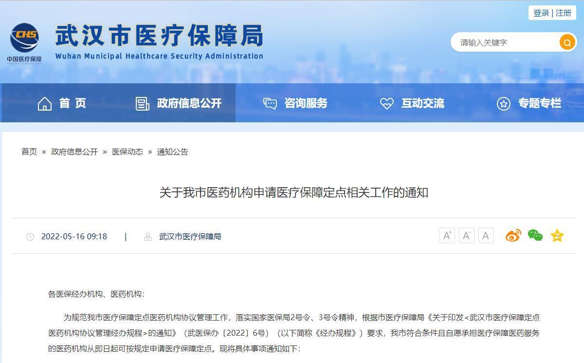 记者在武汉市医保局官方网站看到,近日,《关于印发武汉市医疗保障定点医药机构协议管理经办规程的通知》(以下简称《经办规程》)正式发布,明确符合条件的各类医药机构可申请纳入医保定点管理。这是《经办规程》发布后,武汉市首次启动医药机构医保定点申报工作。