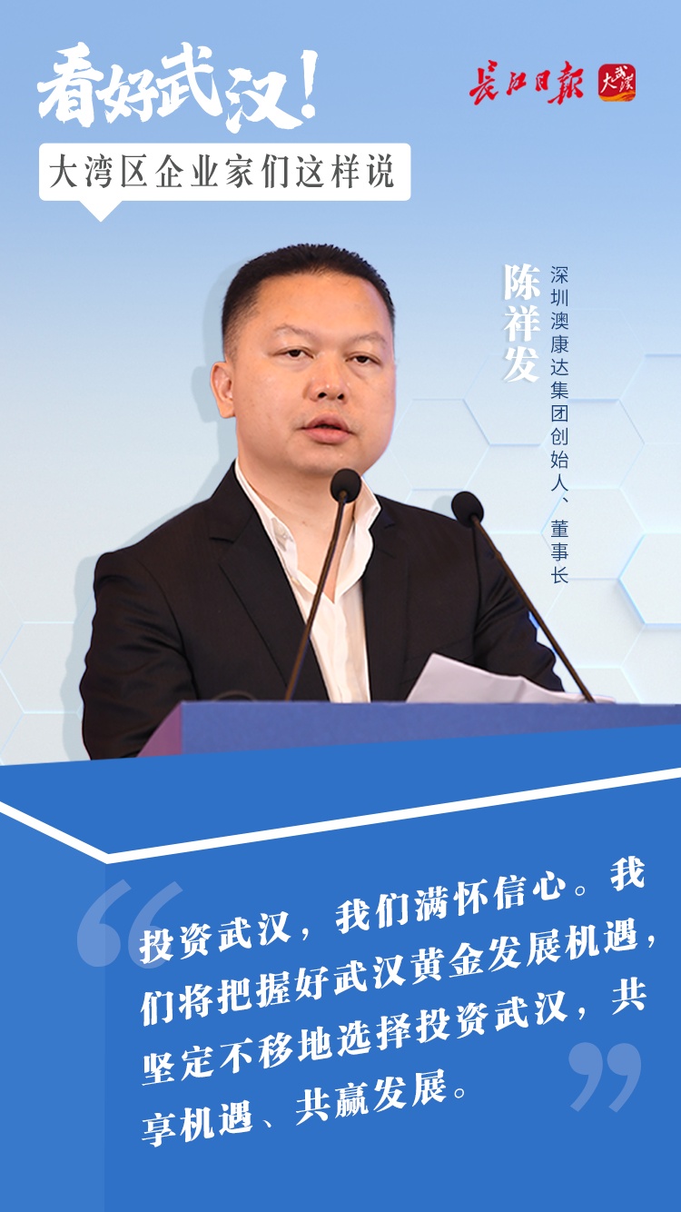 长江日报大武汉客户端5月22日讯 “我们看中武汉,是因为不论是在经济、人才、教育还是地理位置方面,武汉与大多数城市相比较都具有明显优势。所以武汉是我们今年重要的一站。”5月21日,“英雄武汉 相约鹏城”2022粤港澳大湾区招商引资推介会上,深圳澳康达集团创始人、董事长陈祥发说。