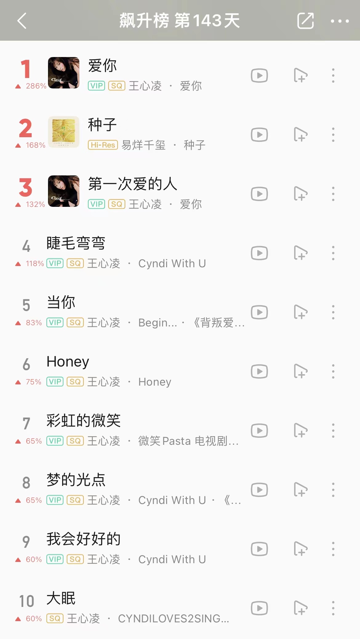 王心凌歌曲霸榜音乐排行榜。图片来源:QQ音乐截图